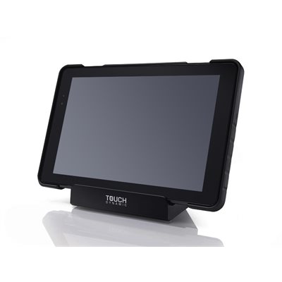 The standard charging dock that accompanies each Quest III Tablet allows the user to conveniently dock the mobile POS device in the upright position. The optional Premium Charging Dock has a key lock, four USB ports, one Ethernet port, one Serial port, and an optional VGA port.